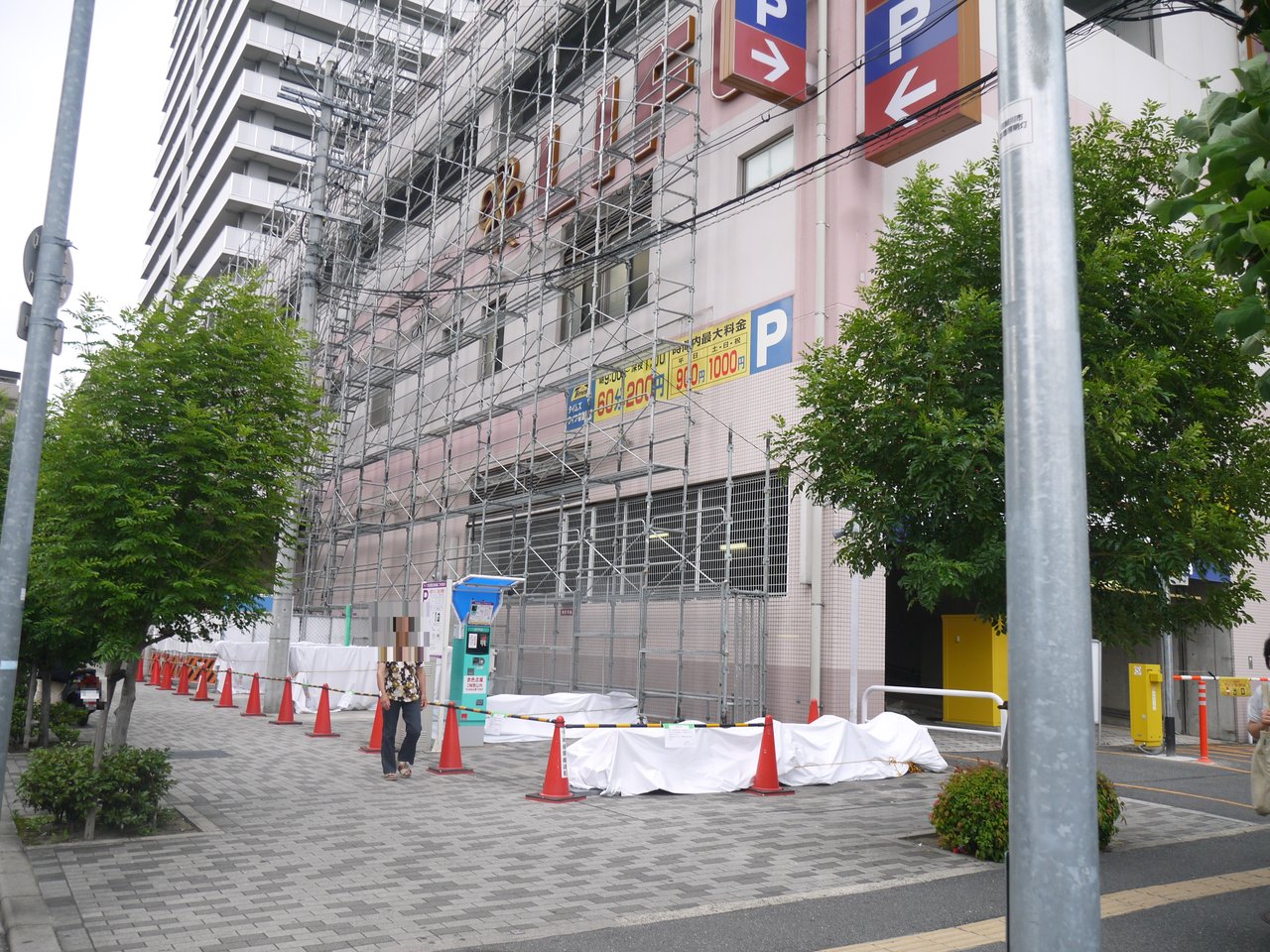 西側(駅の反対側)の外壁では既に足場の設置工事が始まっていて、駐輪場も利用できなくなっています。