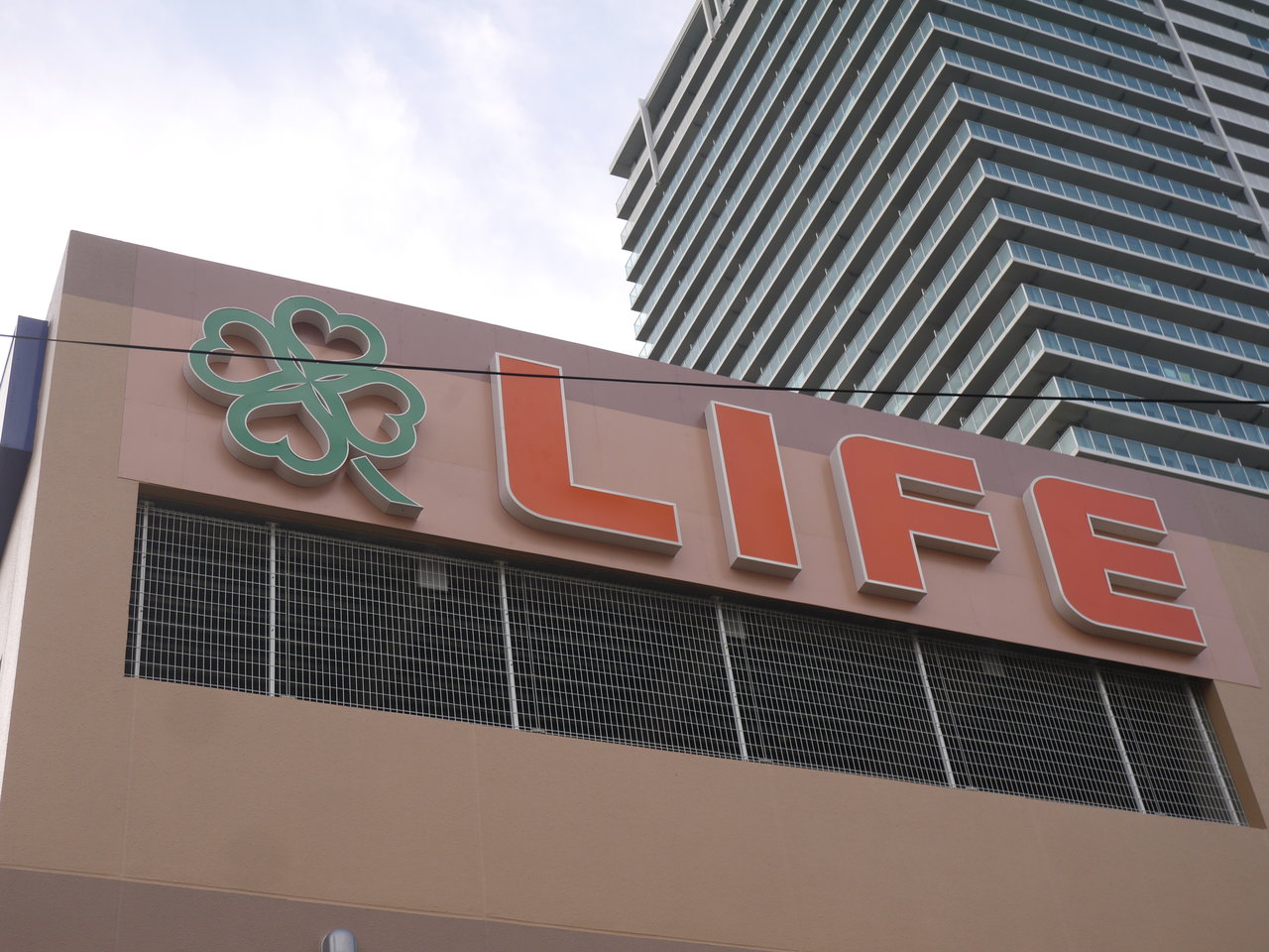 外壁の修繕工事が行われている香里新町のスーパー「ライフ香里園店」で、塗り替え後の新しい外観が見えてきました。