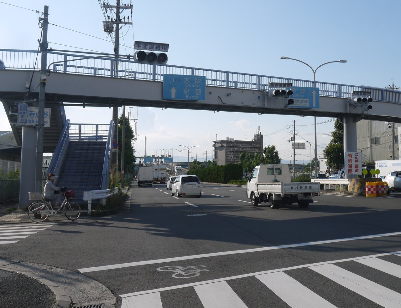 現場は鳥飼仁和寺大橋へ向かう高架橋(右側2車線)と国道1号線に向かう側道(左側2車線)が分岐する地点になっており、