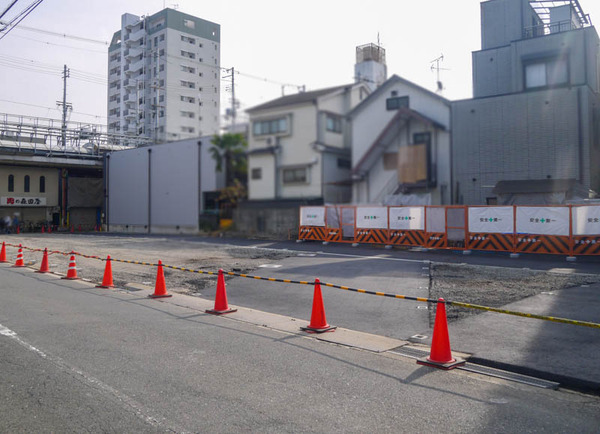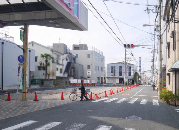 仮歩道が整備されるのはベル大利商店街〜池田本通商店街の区間で、都市計画道路対馬江大利線の整備事業(府道18号線の拡幅事業)に伴い更地になっているところです。