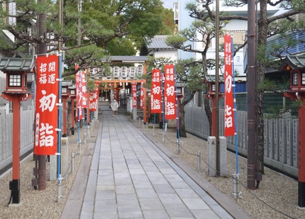道路沿いには、「初もうで」の赤いのぼりがたくさん並んでいます。