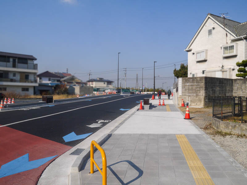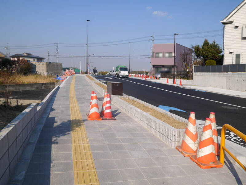 用地買収に遅れが出た西側の区間(下の図の第2工区の部分)の歩道整備が道路の開通に間に合っていなかったもので、歩道の完成により安心して歩けるようになりました。