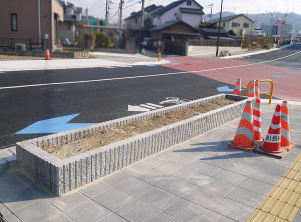 9月30日に開通した都市計画道路寝屋川公園駅前線の西側区間(打上新町)で行われていた歩道の工事が、ほぼ完成した状態になっています。