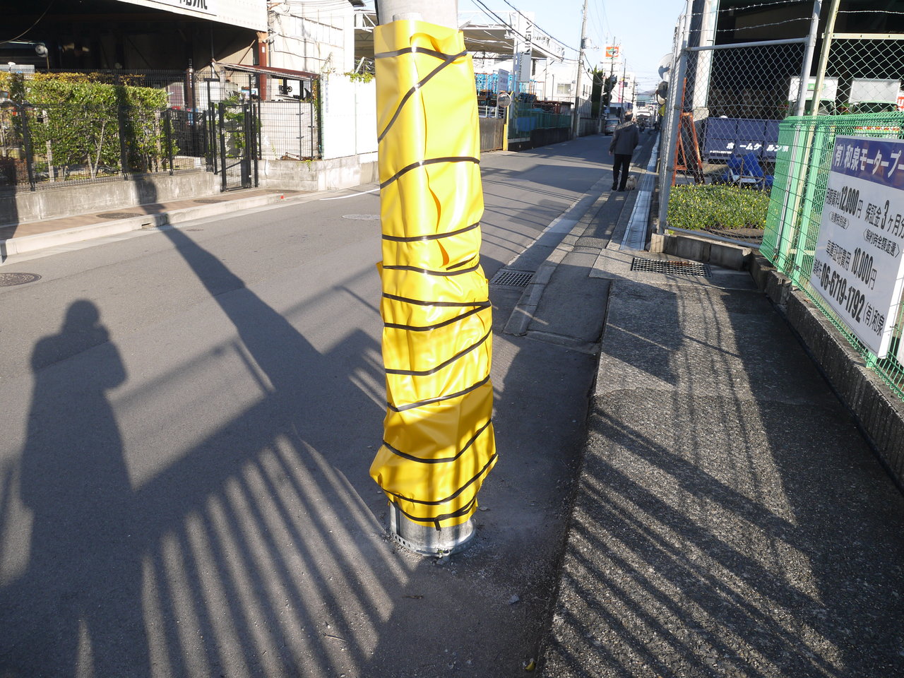 11月23日(木)に様子を見に行くと仮復旧していましたが、電柱に黄色い保護シートが巻き付けられた状態になっています。
