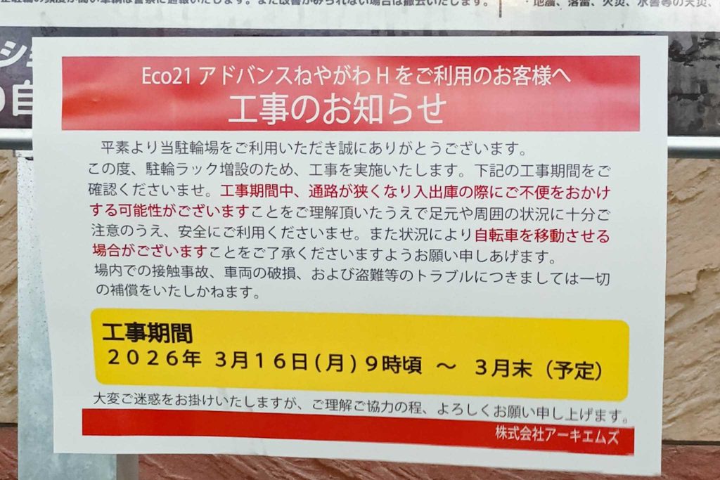 駐輪場の貼紙によると、駐輪ラック増設の為工事を実施するそうです。工事期間は3月末までの予定とのこと。