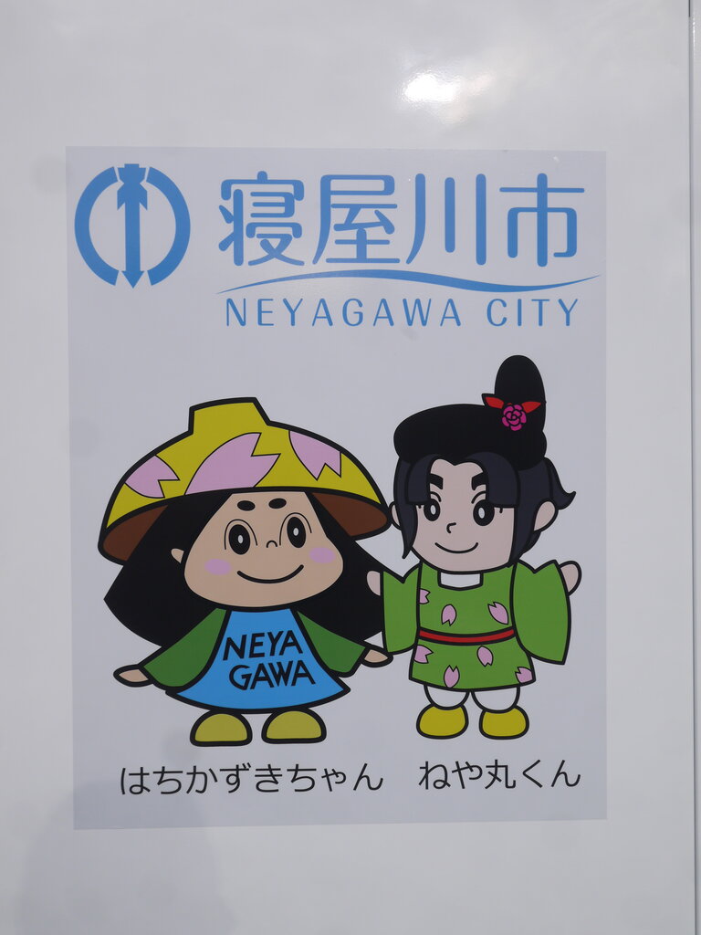白無地の自販機には「ワガヤネヤガワ」(「寝屋川市は我が家のようにあったかい」を意味する言葉)のロゴや寝屋川市のマスコットキャラクター「はちかづきちゃん」と「ねや丸くん」の姿が。