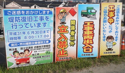 現地の看板によると、淀川と芥川で行われている堤防の災害復旧工事とのことです。