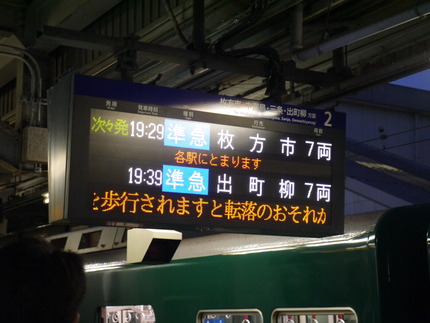 発車標は寝屋川市内の3駅にも設置されていますが、それぞれ機種が異なっていて興味深いです。一番情報量が多くて見やすいのは、香里園駅かな~?