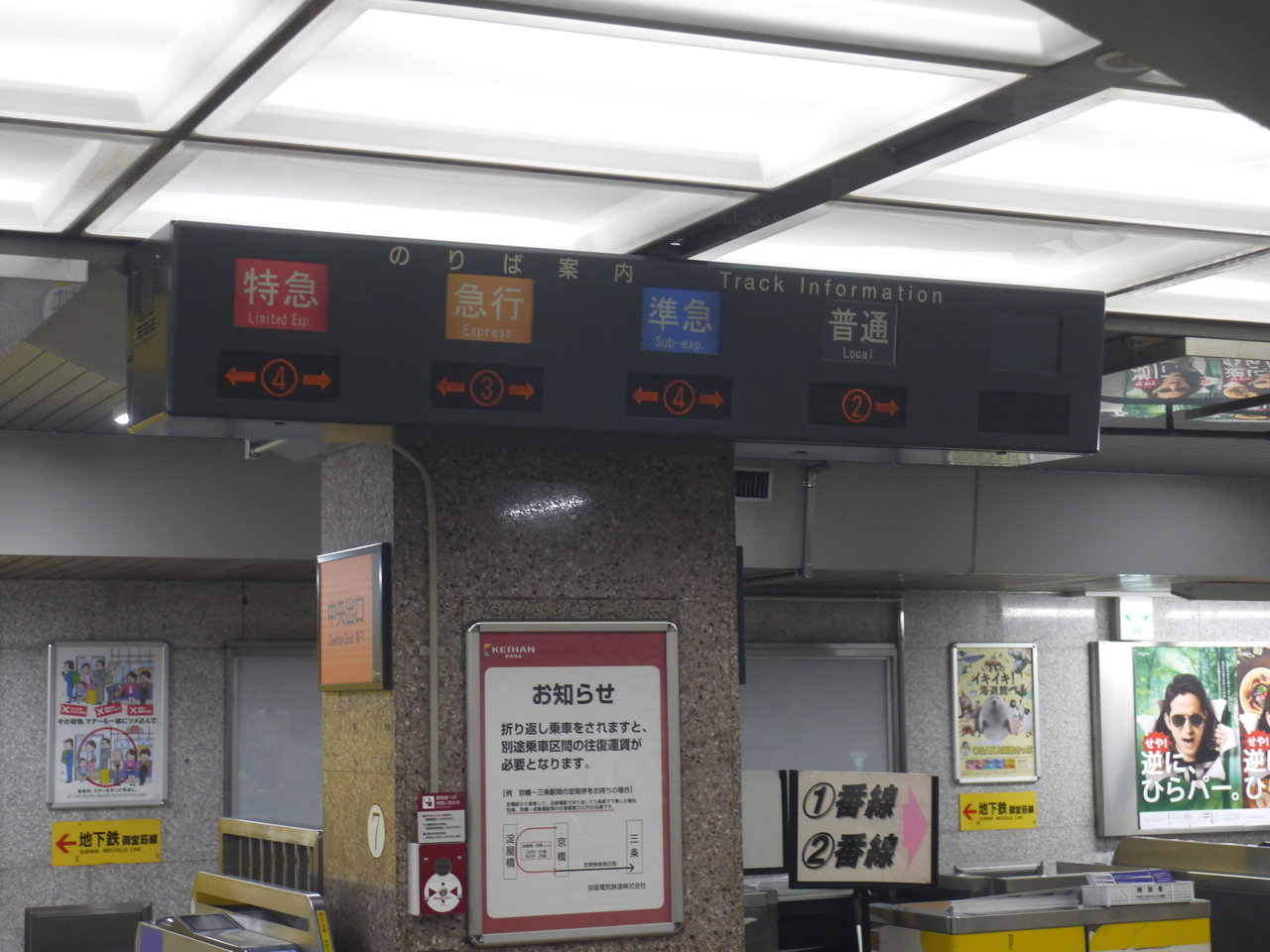 7月のとある日に京阪淀屋橋駅を利用すると、発車標(発車案内板)が新しくなっている様子を発見しました。
